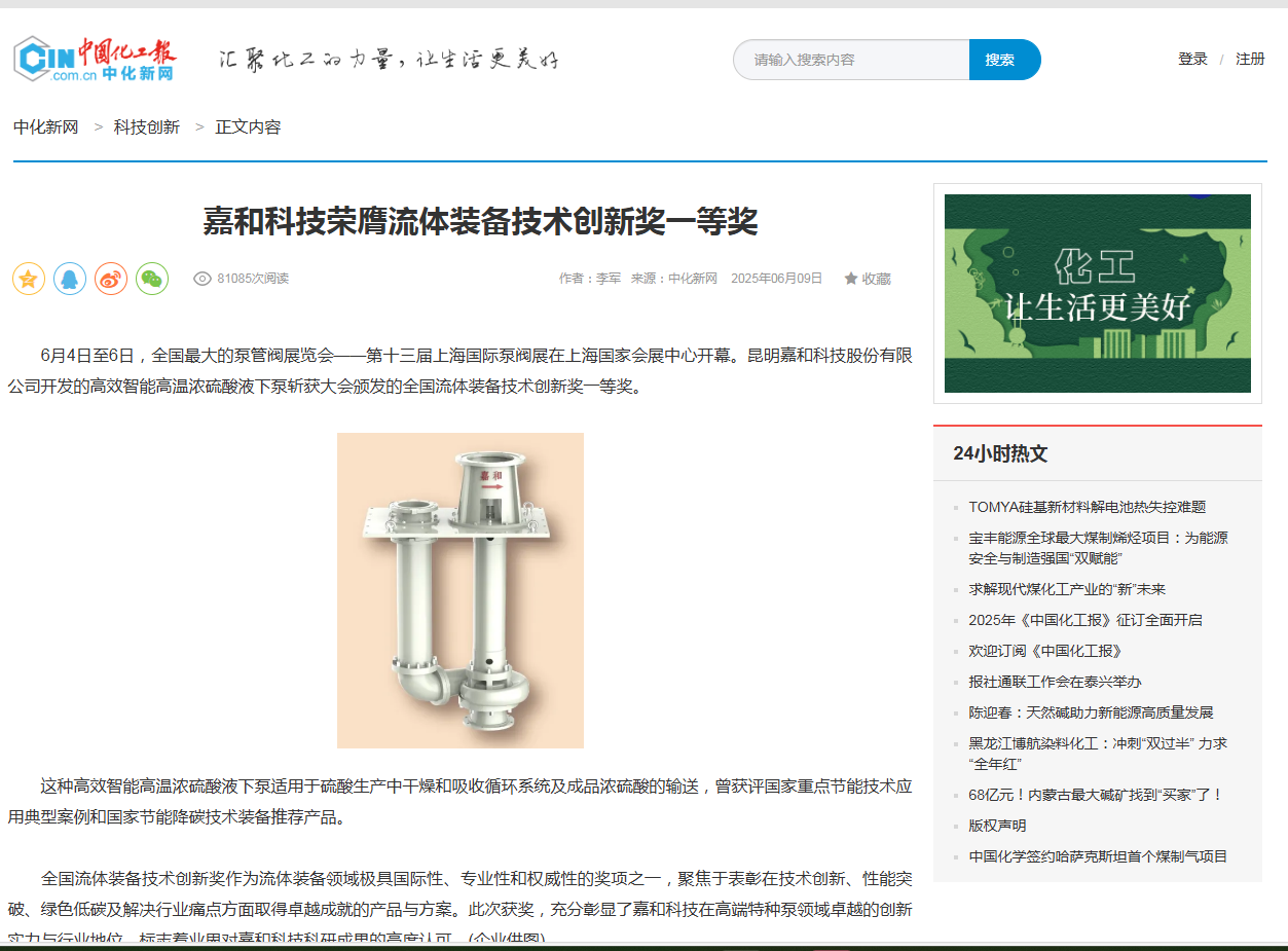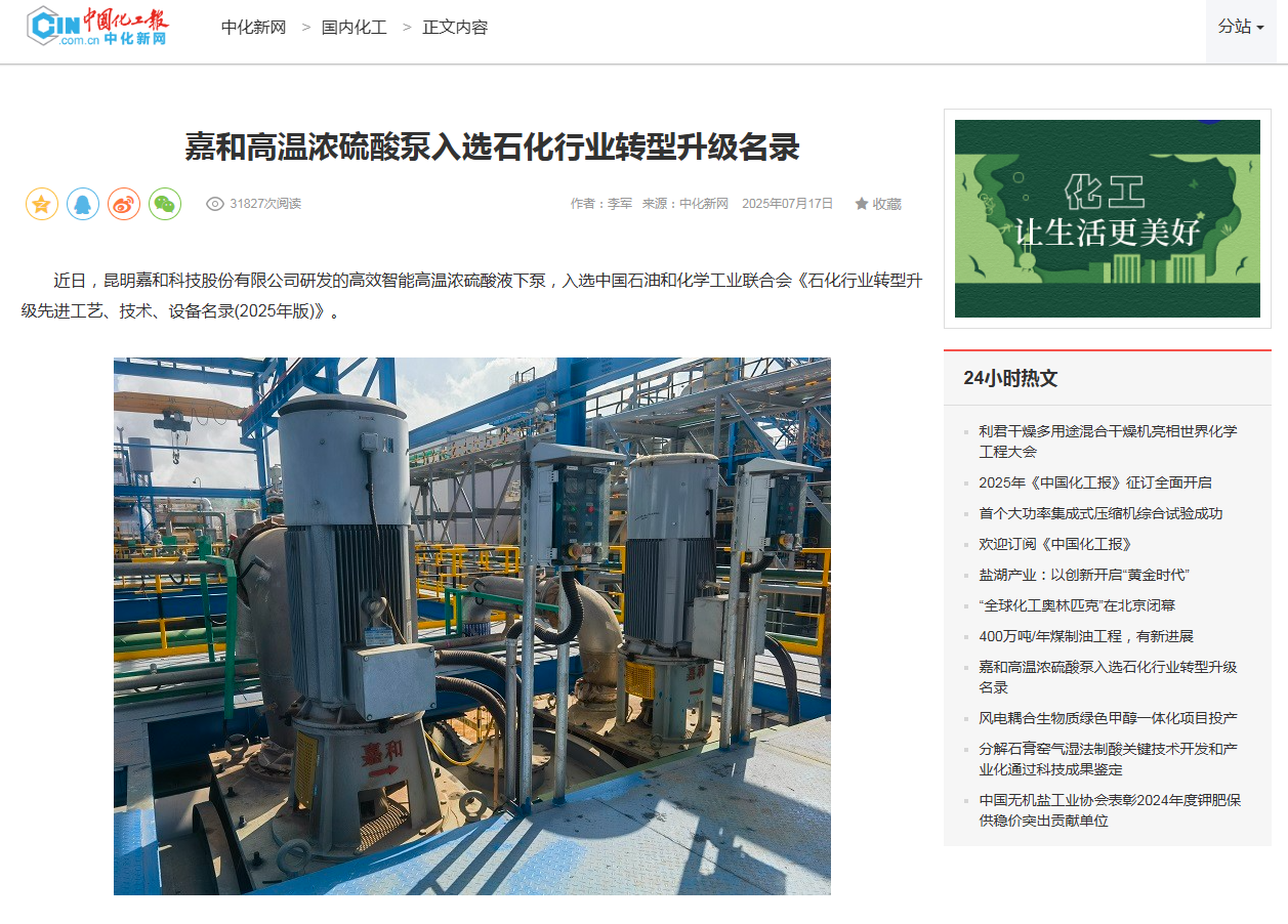 近日,昆明嘉和科技股份有限公司研發的高效智能高溫濃硫酸液下泵,入選中國石油和化學工業聯合會《石化行業轉型升級先進工藝、技術、設備名錄(2025年版)》。