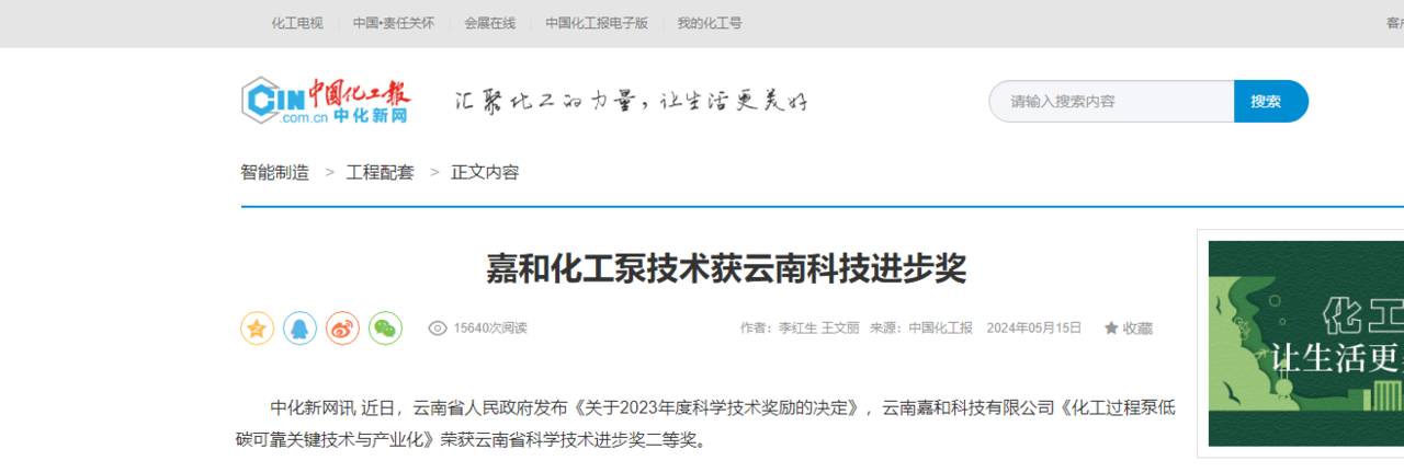 中化新網訊近日,云南省人民政府發布《關于2023年度科學技術獎勵的決定》,云南嘉和科技有限公司《化工過程泵低碳可靠關鍵技術與產業化》榮獲云南省科學技術進步獎二等...